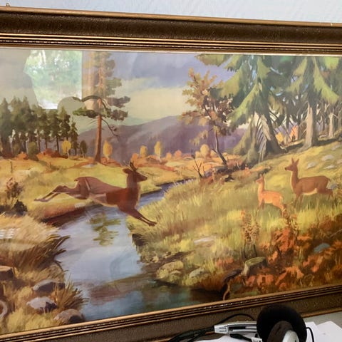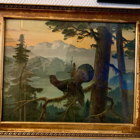 Bildet et brodert med korssting. Glass og ramme. Ingen misfargig. Str med ramme er 82 cm x 56.5 cm