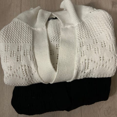 Strikket genser i cremehvit farge, kommer ikke tydelig nok fram på bildene. Genseren er litt kort og boxy. Brukt kun en gang og vasket.