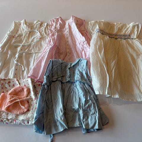 Det meste er helt og fint, men enkelte plagg, som en kjole har noen flekker som ikke er forsøkt fjernet. En bukse mangler søm nederst i beina.