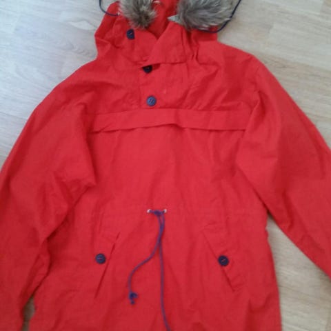 Lite og pent brukt anorakk med fleecefor og reveskinnskant på hetta. Innvendig glidelåslomme+mobillomme. , knyting i livet og er i str 38-40. Lengden er 75 cm. Knapper, glidelås og borelås er helt i orden.