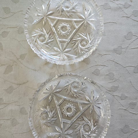 Salt og pepperskåler retro/vintage. Krystall. En liten ripe i den ene. 4.2cm i diameter. Selges kr 400 for begge