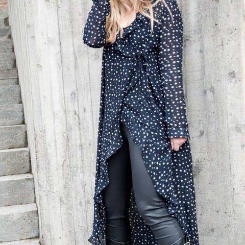 Denne nøytrale fargen er perfekt for bruk når som helst på året. De store stjernetrykkene gjør inntrykk og skaper et grafisk trykk når det vikles rundt halsen.