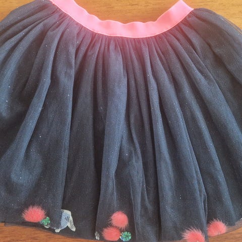 Helt nytt og ubrukt tutu/tyllskjørt i delikat grå farge med små, søte detaljer. Lett og luftig, med behagelig strikk i livet. Perfekt til bursdag, fest, utkledning eller hverdagslek.