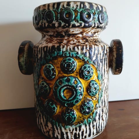 Denne er bare så fin. Syns den ligner Italienske vaser, men kan også være svensk eller norsk. Har ikke funnet noe om denne ennå, mest mulig fra 1970 tallet. Solid håndverk.