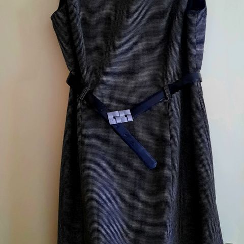 Veldig fin blå farge. Kan brukes med noe under eller uten. Fåret. Praktisk. Kan kombineres med forskjellige belter. Tilsvarer til 38/40 str. 105 lengde. Helt ny. Composition ses på bildet.
