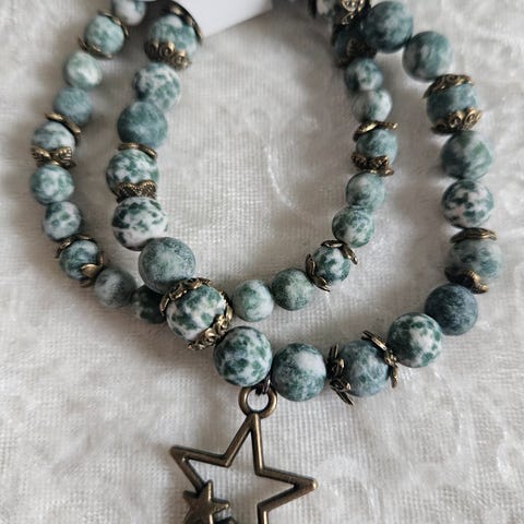 Vakkert smykkesett i 3 deler. Halskjede, armbånd og øredobber håndlaget av 4mm glassperler og forgyllet og polert messing (nikkelfri). Lengden på halskjedet er 45cm. Kan reguleres. Prisen er kr. 250,- + frakt.