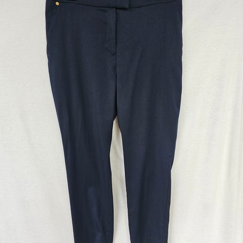 Elegante mørk blå bukse fra Holly&Whyte Lindex med lommer og kapper detaljer. 77 % polyester, 22% viskose. Midje ca 94 cm. Lengde ca 1 meter. Hofte mål ca 130 cm