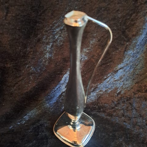 Sølvplett vase, av veldig gammel type, høyde er bare åtte cm. Ø er 8,7. Stemplene er slitt vekk.