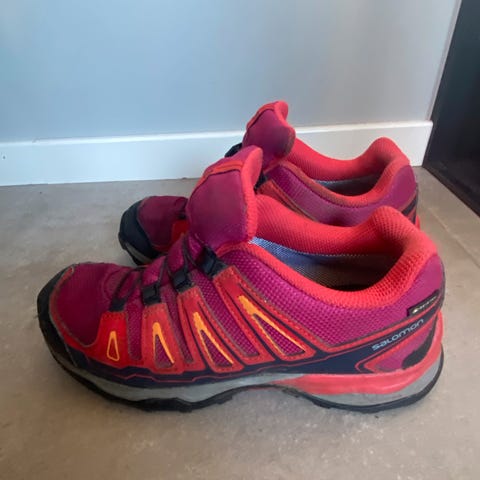 Tursko til dame i str 41, blå og gule farger på skoene. Lite brukt. Veldig gode såler, selges pga for liten str. Nypris 1100 kroner.
