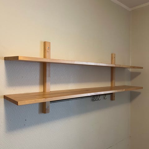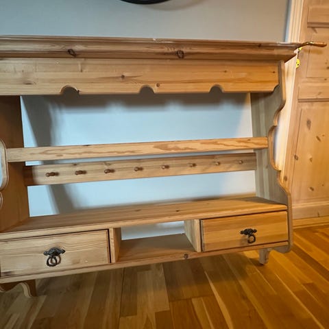 2 furuhylleplater, pent brukte, som nye med 3 solide hyllestativer i metall. Selges sammen for 1800 kr