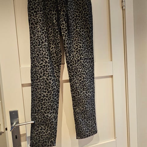 Kjempekul og fluffy pysj bukse i størrelse small / 38 EU. Leopardmønster i rosa. Buksen er lysegrå.