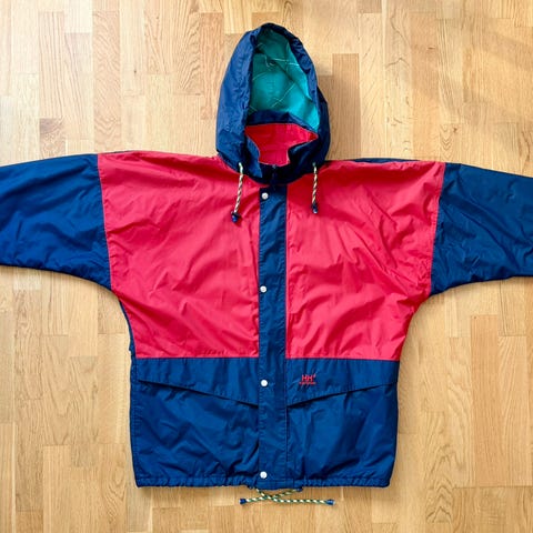 Vakker, lett og praktisk skalljakke fra Helly Hansen i rødt og mørkeblått. Lite brukt (meget god stand). Angir "S" som størrelse, men tilsvarer L (se mål)