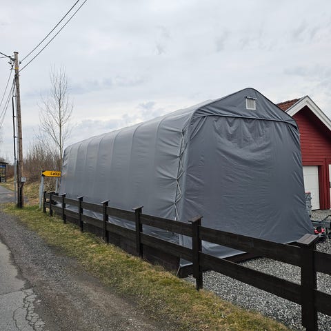 Snøsikker bobil garasje med galvanisert ramme og 610 gr. pr. m2 pvc duk. Fin hall med bruksområder til Båt, Bobil og lagringstelt for campingvogn.