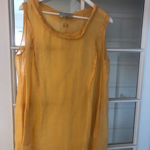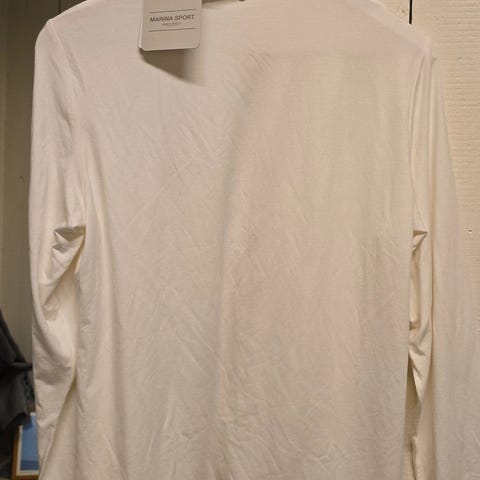 Pent og knapt brukt vest/topp fra Marina sport. (Marina Rinaldi) Fargen er brun med innslag av gulltråder. 44%ull, 44% akryl, elastan og annet. Dyp V-ringning. Kan brukes både på kontoret sammen md en bukse og til fest over et skjørt.