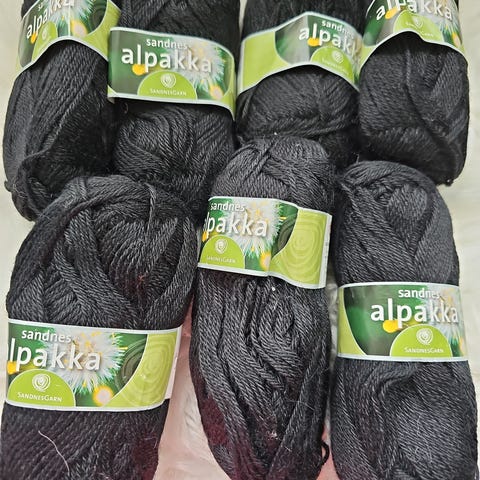 5 nøster sort skjerf garn, 125 kr.