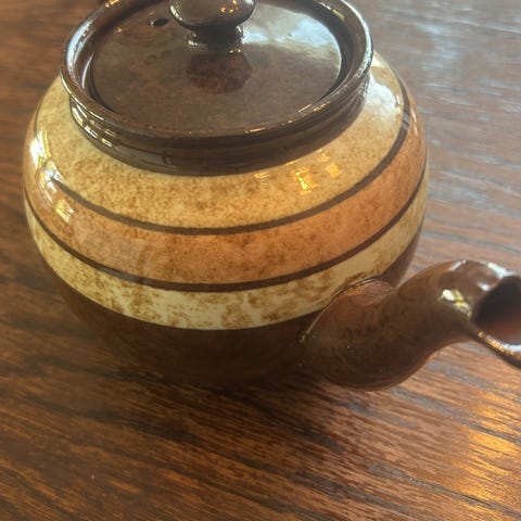 Tekannen er laget av keramikeren Carl Olaf Olsen, Sandnes. Tekannen har en diameter på 17 cm og er 14 cm høy inkludert lokket. Handtaket av bast er er skadet i den ene enden. Ellers ingen skader. Flott tekanne