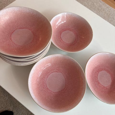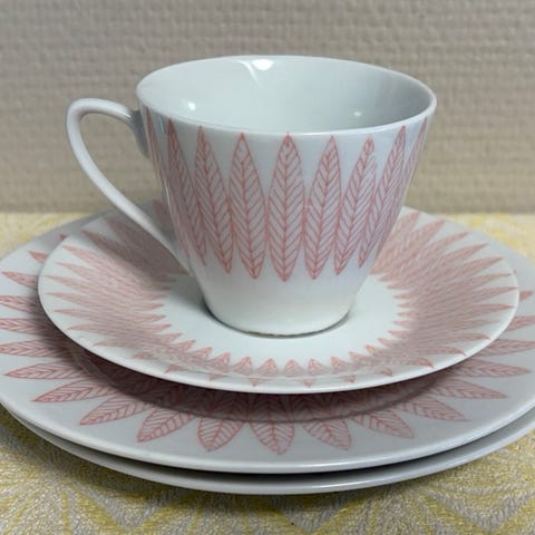 Tallerken og skål sett i rosa og hvitt mønster. Liten tallerken og liten skål.