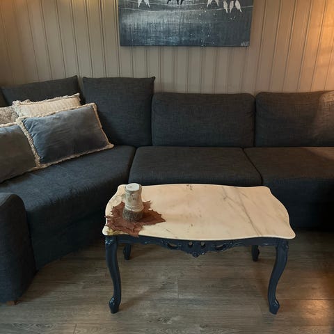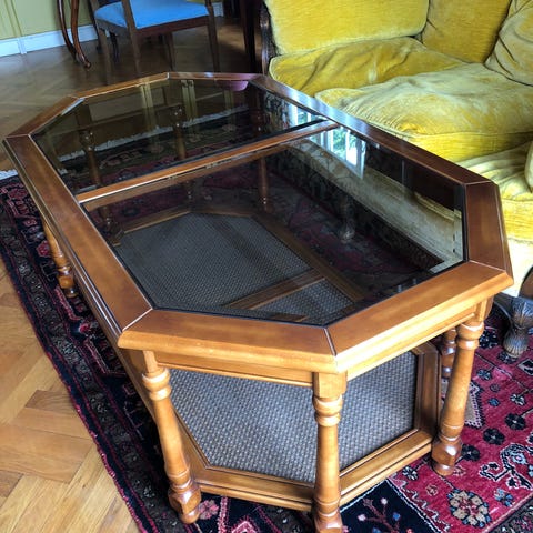 Spansk salongbord (kaffebord), i en mørk tresort. Glassplate danner bordplaten. Det er spesielt i og med at det er lavere enn vanlige norske bord. Dette er kjøpt i Cortes Ingles i 1993 og har tilhørt en familie som har tilbrakt mange år i utlandet. Pen bord på hyllen under, og på siden av bordet. Noen merker på hyllen ved et hjørne, se bildet.
