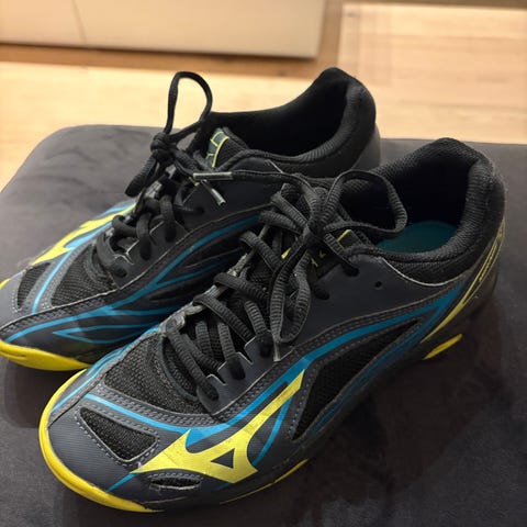 Blå asics str 34.5 og hvite mizuno str 32,5 selges kr 75 per par. Brukt i gymsal og til håndball.