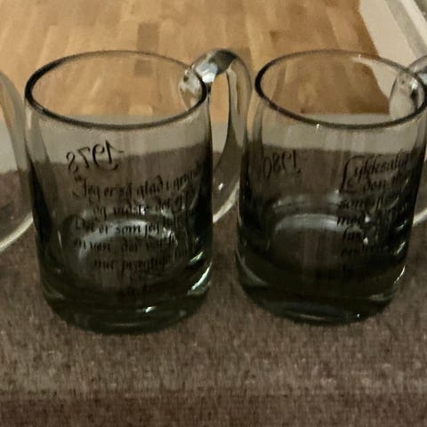 Vintage Hadelands ølglass med solide hank og kraftig bunn, diameter 3 store av 11 cm, høyde 12, 5 cm. Den fjerde har lokk i tre og 2 hank. Diameter 12 cm, høyde 10, 5 cm. Den minste med "Odin" med dato på 1978 : Diameter 9 cm og høyde 11 cm. Selges 200 kr per glass. Kan sendes