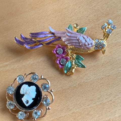 2 håndmalte brosjer selges. Emalje og perler. Signerte. For mål, se bilder. Pris pr stk. 100,-. Kr. 180,- hvis kjøpes samlet.