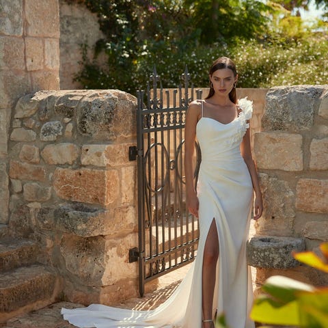 Jeg kjøpte kjolen ny hos Maria Schei Brudesalong før bryllupet våren 2022. Kjolen kostet 24 000 kr. Til kjolen følger det et elegant, avtagbart sjal som lett kan kneppes av og på. En veldig fin detalj til kjolen.