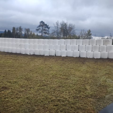 Innpakket Tørr Halm og tørt fint gras i rundballer.