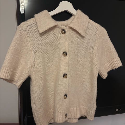 Beige ribbestrikket cardigan fra Tricot som kan brukes på mange måter: Løst hengende, lukket med en nål eller belte, eller med utbrettede slag. Pyntehempe med tre små diamanter øverst bak.