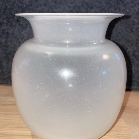 Ca 15cm høy. Dia ca 20 cm. Åpning ca 10 cm. Brukt få ganger. Kjøpt I glassmagasin på 1980-tallet . Noen små bobler i glasset. Kan den hete curl.? Kjøper betaler porto.