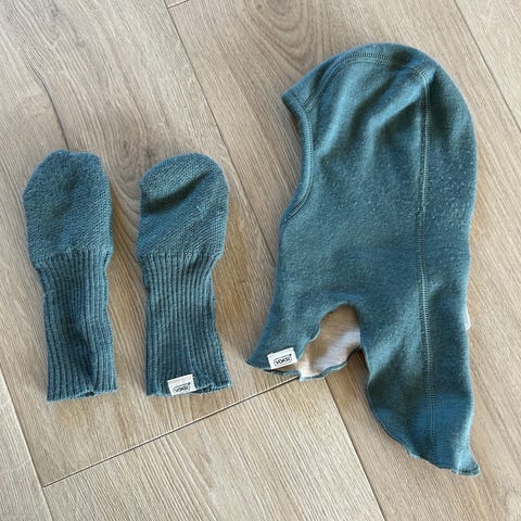 Størrelse 56-62. Aldri brukt. Lue og votter i ull. Økologisk. Kan sendes. Kjøper betaler frakt.