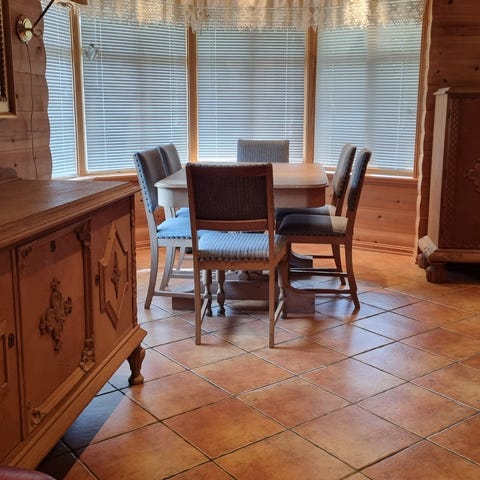 Meget spesiell spisestue, kompakt i heltre flammebjerk. 10 stoler. 2 lemmer, en på hver ende av bordet.