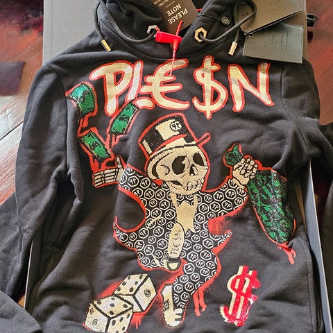Philipp Plein genser i small selges. Størrelse tilsvarer small/medium vil jeg si. Alt av emballasje og bag følger med, samt kvittering og tags fra kjøpet. Signatur edition av genseren.