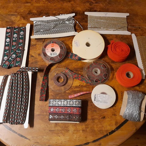 Ca 8 kg bomull skråbånd noen hele noen tatt av + noen nylon. Ass farger. 3,5 cm og 2.5 cm bredde. Kr 400.-