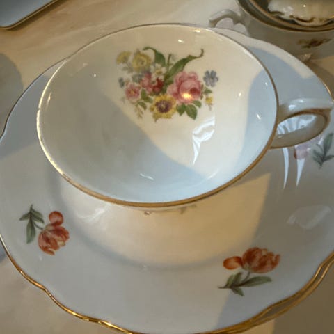 1 kopp, 3 skåler og 3 asjetter med vakkert, småblomstret rosemønster. Selges gjerne samlet. Kan sende. Kr 150 for alt.