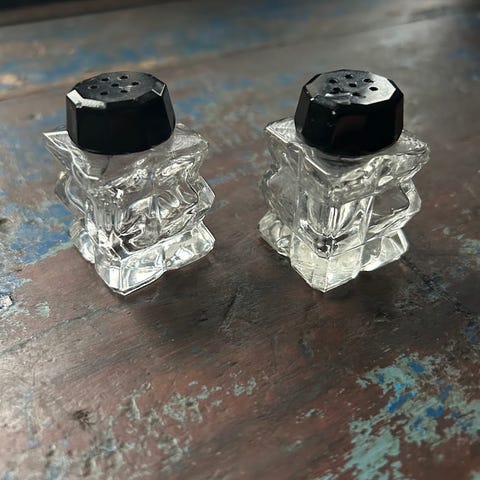 Vintage saltbøsse formet som en bulldogg selges. Klart glass med plastkork. Meget god stand, ingen skår/skader.