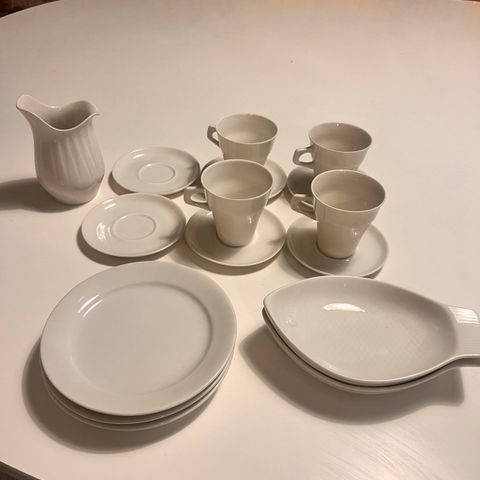 12 stk Kaffekopper, 12 stk tefat, 12 stk dessert fat. 1 stk fløtemugge, 1 stk sukkerskål, 1 stk tekanne. Komplett totalt 39 deler.