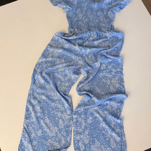 Selger en pent brukt blå, off-shoulder jumpsuit, str 158, for 150 kr.