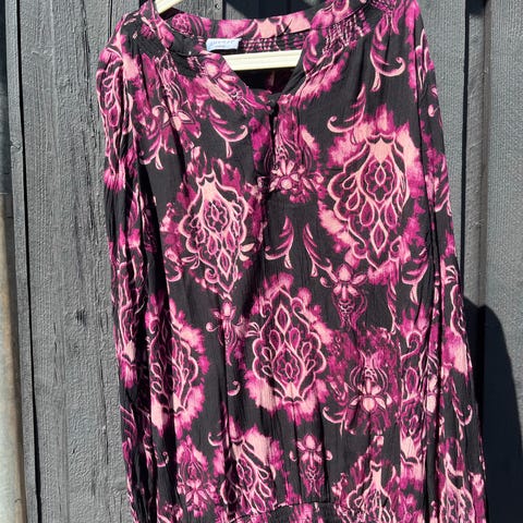 Pen gråhvit,svart bluse,mønstrete. Lett stoff. 100 % polyester. Ekstra knapp følger.