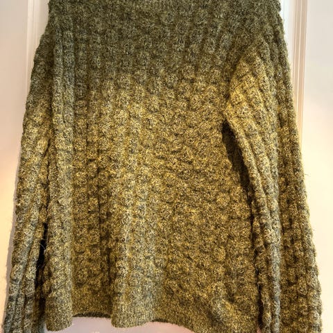 Fantastisk grønn turkis genser i 100% viskose fra det norske merket Maud. Den har rysjer over hele armene og ryggen og er i en myk strikket kvalitet. Den har god stretch og er romslig i størrelsen så vil også kunne brukes av en M.