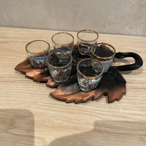 6 søte shot - akevittglass med gulldekor og metallholder. Passer fint til både julebordet og ellers hele året.