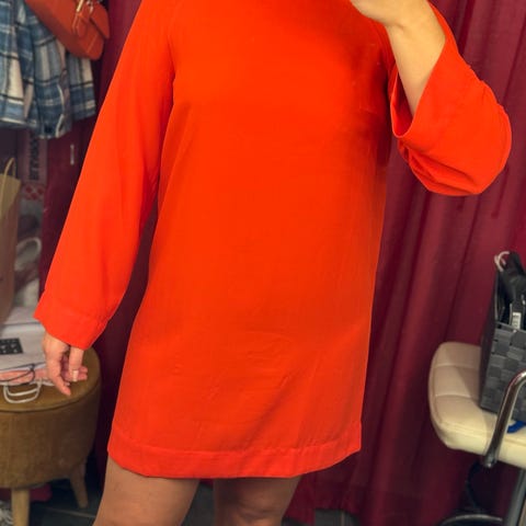 Nydelig rød kjole i økologisk ull fra Living Crafts. Strl. large ( står både medium og 40/42 på lappen - mer som en large). Maskinstrikket ull som gir tyngde til stoffet, som faller pent. Kjolen har lommer i sidene. Kjøpt på Grønt skift, men aldri brukt- merkelappen er på. Kan sendes mot st kjøper betaler frakt.