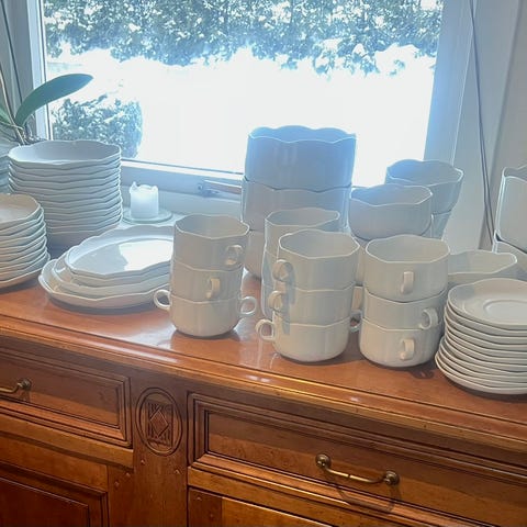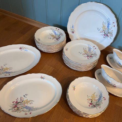 Selger mitt flotte middagservise Amadeus i benposelen, fra Royal Grafton. Serviset fremstår meget pent brukt, har blitt brukt til julemiddag 6 ganger og er blitt vasket for hånd. Serviset var vanvittig dyrt, men fortjener å bli brukt fremfor å stå lagret i skapet hos meg. Ønsker å selge alle av samme type samlet, men kan dele middag i 8+12.