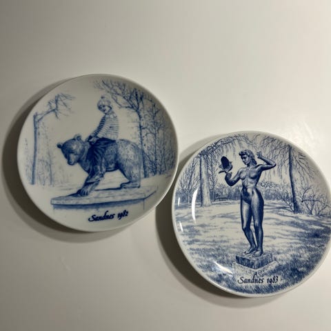 Veldig kjekke samle tallerkner med motiv fra Hommersåk. Merket med årstall. Det er skår i den ene tallerkenen. Gi bud! Minstepris 900kr.