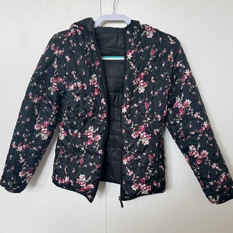 Nydelig fargerik ytterjakke m flott blomstermønster. Str Large. Ubrukt.