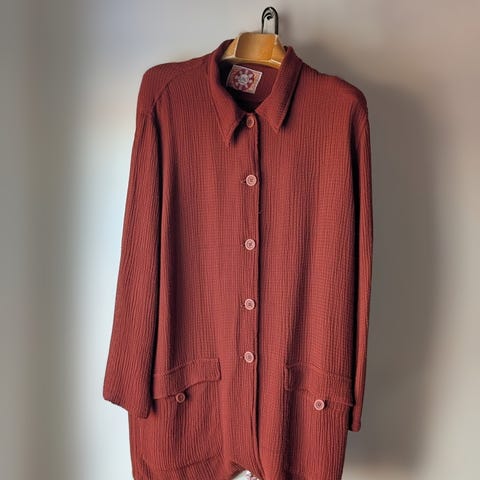 Flott og fargerik jakke i 100% polyester. Med sort bunn, rød, gul, lyseblått og beige blomstermønster. Str Large, men ikke spesielt stor for størrelsen. Foret, god og varm. Glidelås og knapp i halsen. To nesten usynlige lommer med glidelås på siden. Ubrukt og som ny. Mål: 69 lang fra nakken, 108 cm bred fra armhule til armhule. 47 cm lang fra armhulen og ned langs armen. Fin også å gi i gave. Kan møtes i Trondheim sentrum, kan prøves eller sendes mot dekning av porto fra posten. Kan evt tas med til Oslo om beskjed gis før 18.3.