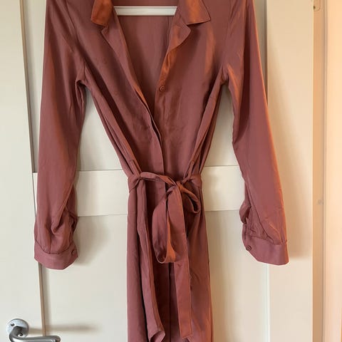 Langermet omslagskjole med en knutedetalj ved midjen. Kjolen er perfekt for festen, rosa og kort. Den har en krage, v-ringning og brede mansjetter.