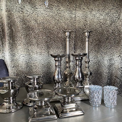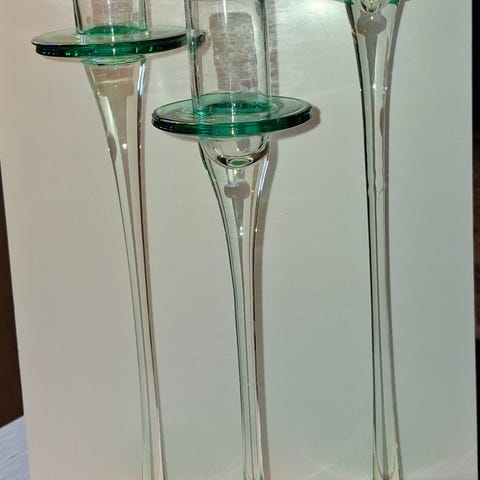 Telysestaker grønn 30 cm og grå 20 cm.