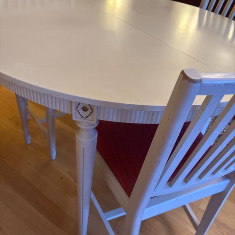 ØNSKER Å KJØPE TILBAKE! Gammelt spisebord til salgs. Flott både til små og store selskaper. Etter 39 år ønsker vi forandring og har kjøpt nytt (brukt) bord i en annen stil. Spisebordet ble kjøpt brukt i 1983 og senere pusset opp. Det er sannsynligvis fra 20-tallet. Det er fortsatt i god stand og har mange år igjen. Til vanlig har vi hatt bordet stående med 1 ileggsplate. Denne ileggsplaten har sarg. Da er det 188cm langt. De 4 andre ileggsplatene har ikke sarg. Alle plater er 60 cm brede. Med alle 5 ileggsplatene blir bordet 428 cm. Dekker komfortabelt til 16, men vi har greid å plassere 20 stoler rundt bordet når det sitter 2 på enden. Helt slått sammen er bordet 128cm x 115cm.