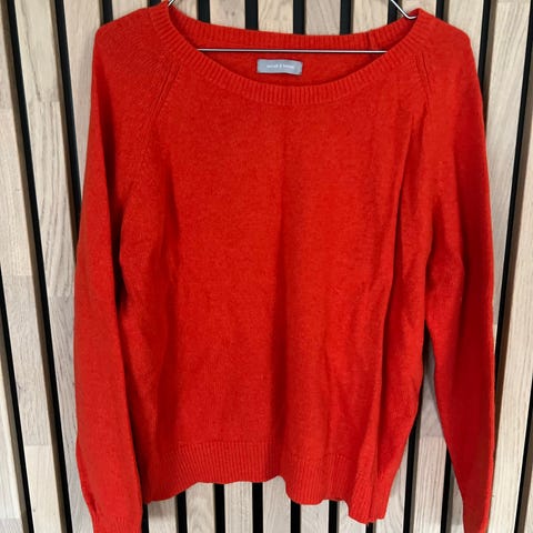 Fargen er varmrød. Materiale: Akryl, metallfiber, nylon