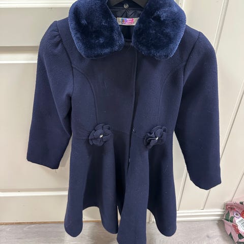 Selger en superfin vinterkåpe fra salto. Denne er bare helt nydelig med pelsdetaljer i hals og ermer. Fin blåfarge. Pent brukt. Str 98/104.